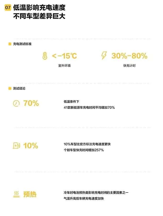 在此次懂车帝的测试中,除了续航还有充电,测试人员通过计算低温环境下车辆从30%充至80%电量的时间,测试结果显示除了个别车型外,低温充电时间平均增加70%,整体充电时间受气温影响非常明显,尤其是冷车时的电池预热,是影响充电时间的主要因素之一。