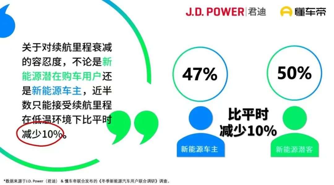 结合此前懂车帝与J.D. Power(君迪)联合发布的冬季新能源汽车用户调研报告,可以发现问题的严重性。在受访的4330份新能源车主的调查中,50%的受访者表示低温条件下最多能接受续航衰减10%。