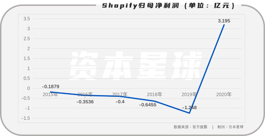 2020年突如其来的新冠肺炎疫情加速了电子商务的发展,进而推动了Shopify平台GMV和MRR(每月经常性收入)的快速增长。2020年,Shopify是实现归母净利润3.195亿美元,同比大赠355.93%。