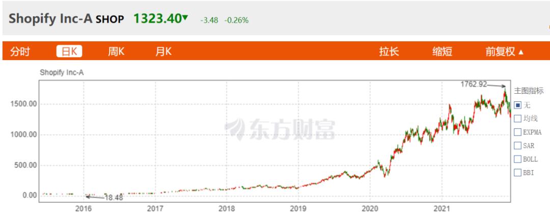 优良的业绩表现,让Shopify的股价一路高涨。2015年5月22日上市时,Shopify IPO价格为17美元,到今年11月19日盘中高点一度突破1762美元/股,六年半里,股价大涨百倍,总市值也到达2221亿美元。