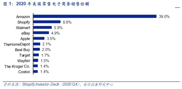 截至2020年Q4,Shopify超越eBay、Walmart等老牌巨头,成为美国市场份额仅次于亚马逊的第二大零售电商平台。