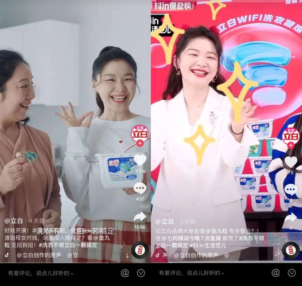 今年 10 月,立白正式官宣金靖为品牌大使,随后立白抖音官方账号陆续发布了一系列由金靖出演的喜剧短片。短片主要围绕 Z 世代、新婚女性及年轻职场人的痛点展开,通过金靖幽默搞笑的演绎,展现「立白 WIFI 洗衣凝珠」优势的同时,更拉近了品牌与消费者距离。经过短视频预热,金靖还空降了立白品牌的抖音直播间,其中「一分钟抛凝珠挑战」、「金靖 WiFi 珠使用趣事分享」等活动,进一步深化了产品的核心卖点。