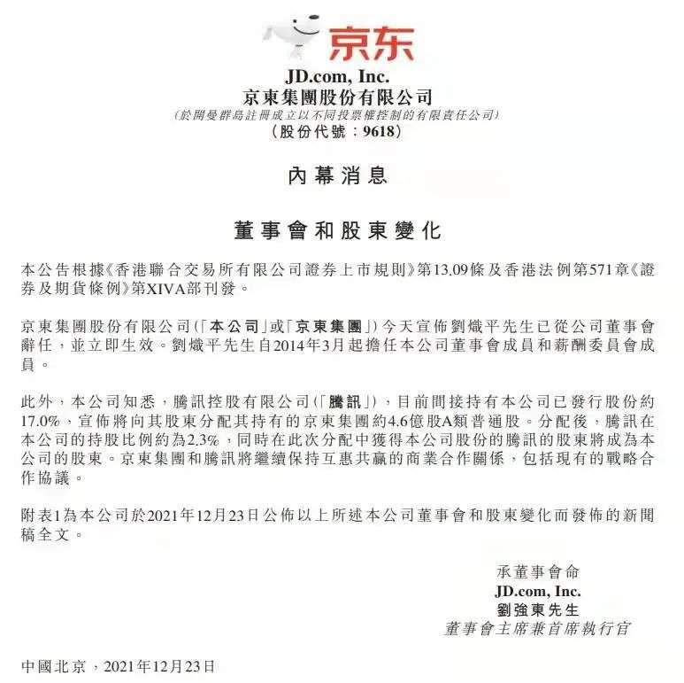 12月23日,腾讯宣布派息式减持京东,股东持有每21股股份获发1股京东集团A类普通股,腾讯持有京东股份由此从17%下降至2.3%,不再为京东第一大股东。