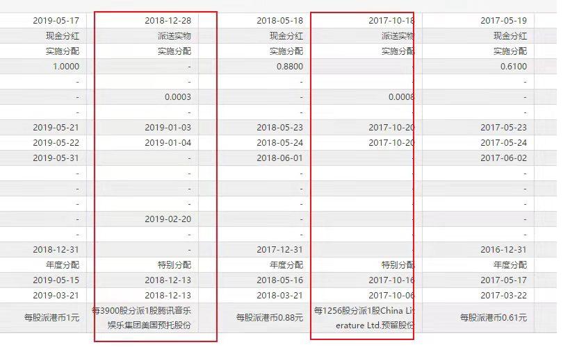 在腾讯历史上,还曾有过两次向股东派送腾讯系上市公司股份的情况。2017年10月,阅文分拆上市时,腾讯股东每持有1256股股份的完整倍数可认购1股阅文预留股份;2018年12月,腾讯音乐分拆上市时,每持腾讯3900股股份的股东获分派1股腾讯音乐ADS。