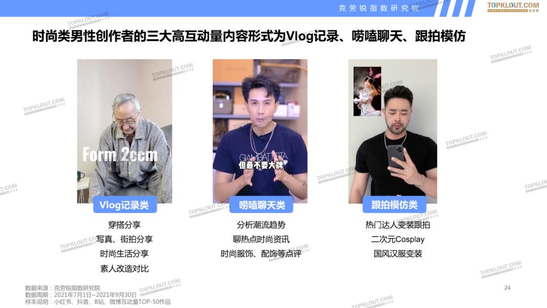 克劳锐的调查与研究发现,不同平台的男性内容创作者在内容方向与创作风格上有很大的差异。