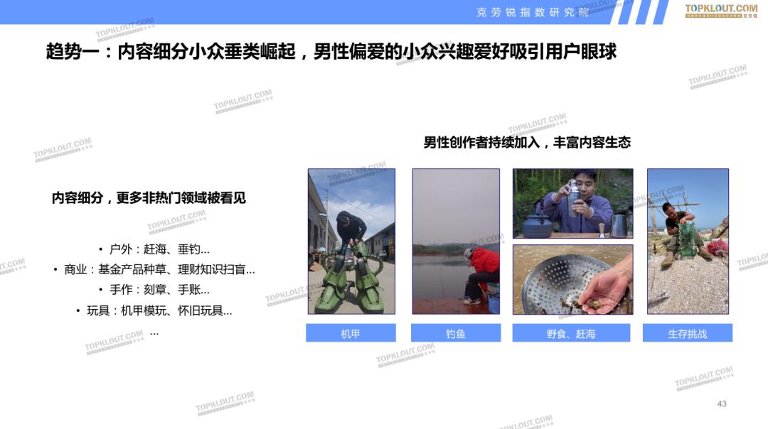 当下内容平台的垂类呈现精细化的发展趋势,内容细分之下,小众垂类崛起,男性偏爱的小众兴趣爱好逐渐吸引用户的眼球,这给男性内容创作者划出了一条实现弯道超车的赛道。