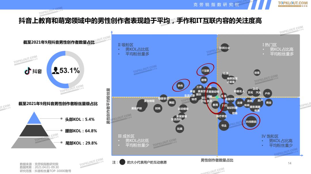 抖音的男女创作者整体比例较为均衡,男性创作者主要聚集在户外、商业领域,教育类的视频内容更能吸引男性用户的关注。