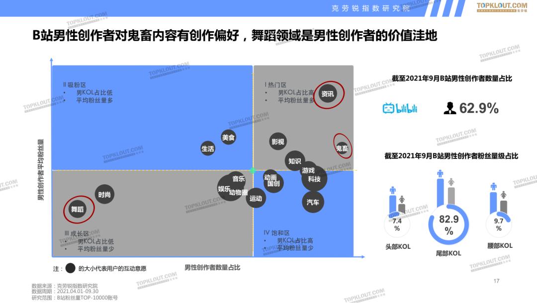 对于B站而言,男性是其主要的内容创作群体,分布在内容创作的各个领域之中。鬼畜内容领域中的男性创作者已接近饱和,专业资讯解读和新闻资讯吐槽类内容的男性创作者表现突出。