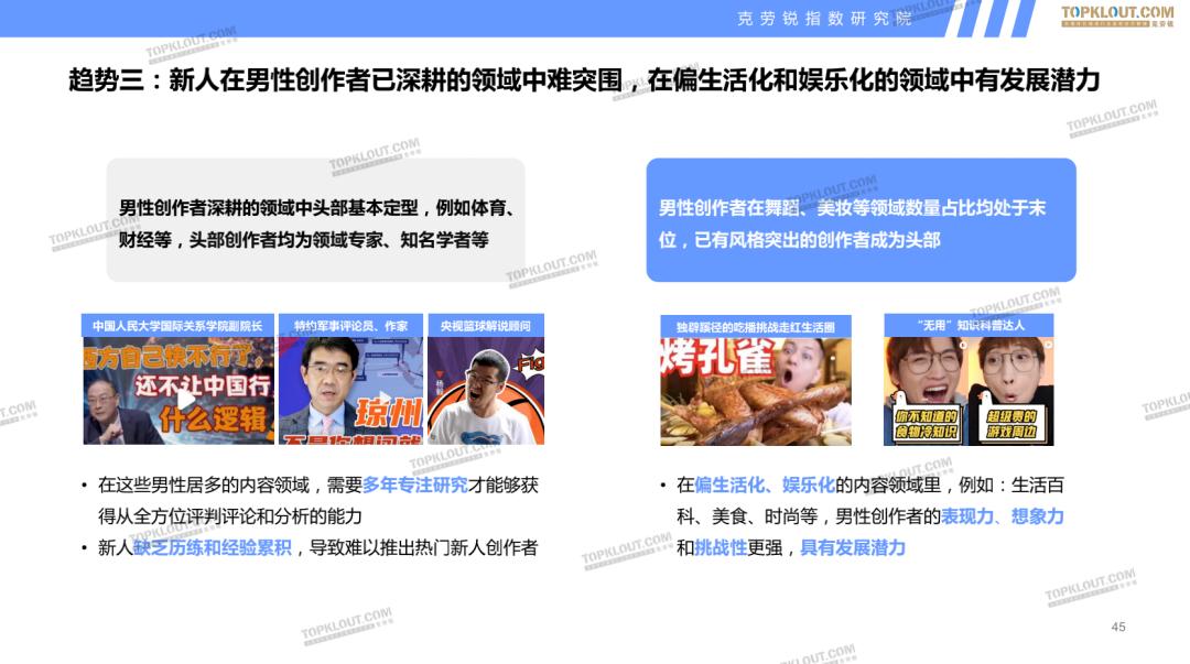 不同内容平台上的男性创作者分别有什么特征?他们和女性创作者在内容创作上有什么区别?男性创作者在内容平台上有怎样的发展趋势?