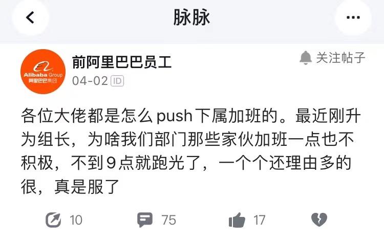 “push”这个词常常会用在组员和小组长的相处中,指的是抽鞭子、催进度,让组员跑得快一点、再快一点。刘鹏记得去年年前,小组长让刘鹏做一个需求,本来说4月中旬之前做好就行。但是小组长为了让自己年底业绩好看,和他说“年前不搞定,就不要回家过年”,除夕夜还在群里@他远程改bug。