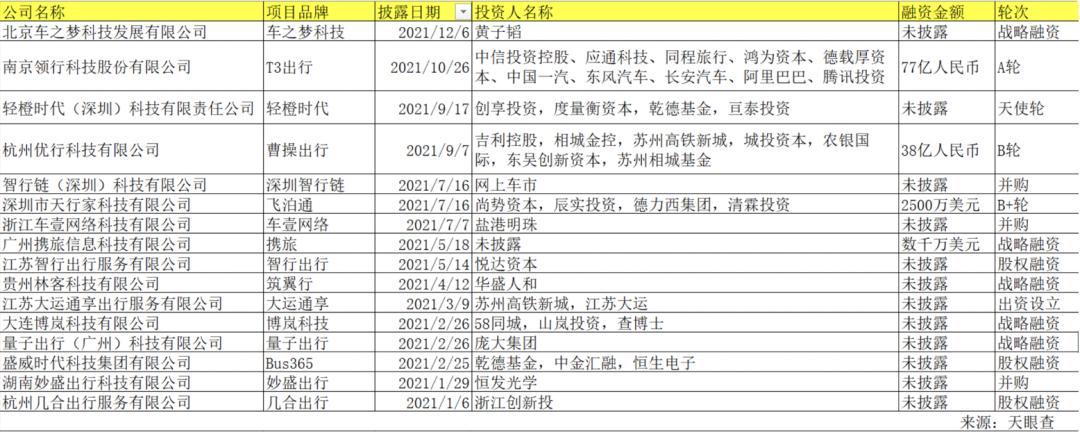 据天眼查不完全统计,2021年网约车相关行业共发生约16起融资事件,从已披露的金额看,融资总规模超百亿元人民币。其中,从已知信息看,排名前两位的是T3出行与曹操出行。