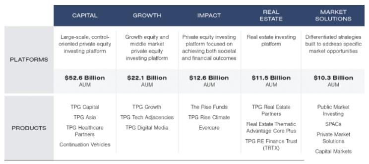 而TPG的投资平台涵盖5种资产类别:私募股权(Capital)、成长型投资(Growth)、影响力投资(Impact)、房地产(Real Estate)和市场解决方案(Market Solutions),截至今年9月30日,各类平台管理规模分别为526亿美元、221亿美元、126亿美元、115亿美元和103亿美元,共计管理资产1090亿美元。