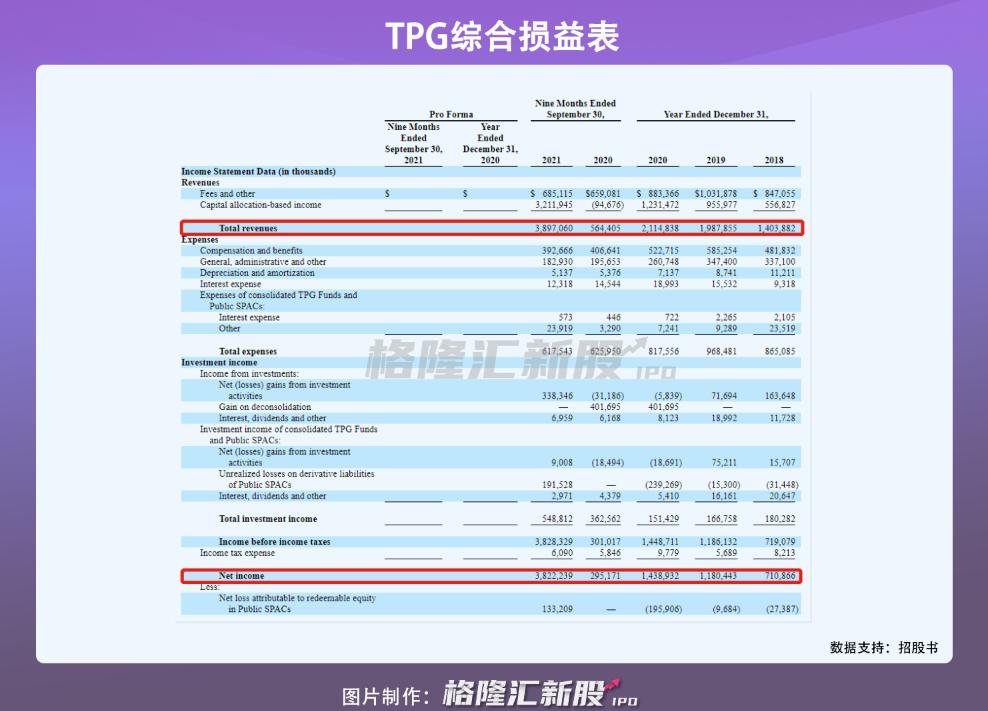 2018年至2020年,TPG分别实现营收14.04亿美元、19.88亿美元和21.15亿美元,同期净利润为7.11亿美元、11.8亿美元和14.39亿美元。值得注意的是,2021年前9个月,TPG的营收为38.97亿美元,净利润为38.22亿美元,而上年同期营收为5.64亿美元,净利润为2.95亿美元,受疫情影响,市场剧烈波动,拖累TPG 2020年的业绩下滑不少,营收利润双双备受打击。