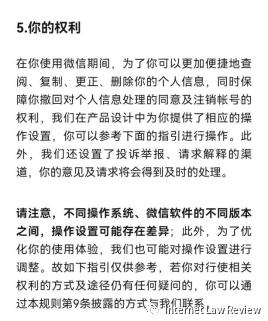实际上,在《个人信息保护法》正式生效前,《信息安全技术 个人信息安全规范》(GB/T 35273-2020)已对个人信息的查询、更正、删除、响应、投诉等一系列主体权利作出了规定,但该规范仅仅属于国家标准,强制力较弱。在《个人信息保护法》以专章对“个人在个人信息处理活动中的权利”进行了明确规定后,查阅、复制、转移、更正、删除等内容应被纳入App隐私政策。