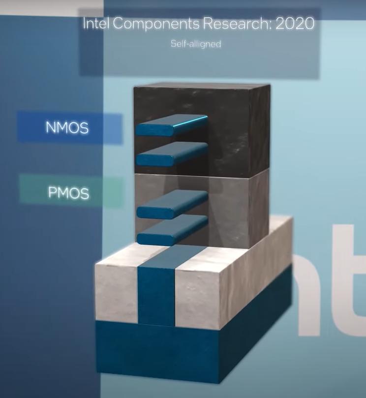 2020年,英特尔实现了3D堆叠的multi-RibbonFET硅晶体管,而且这是采用了自对准的工艺,这代表英特尔不用先后制作上下部分进行封装,而是同时堆叠制造上下晶体管,减少了制作工序、时间和成本。