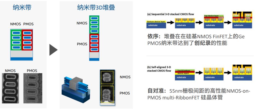 今年IEDM英特尔在硅基3D堆叠的RibbonFET晶体管结构和依序堆叠的CFET晶体管结构上都取得了研究进展,为了方便理解,英特尔给出了一个比较详细的演进过程。