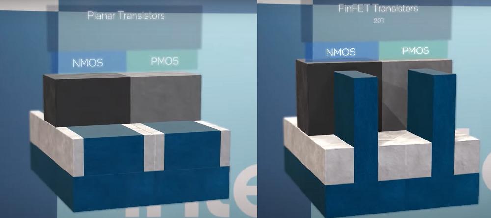 ▲传统的平面晶体管结构(左)和FinFET晶体管结构(右)(图片来源:英特尔)