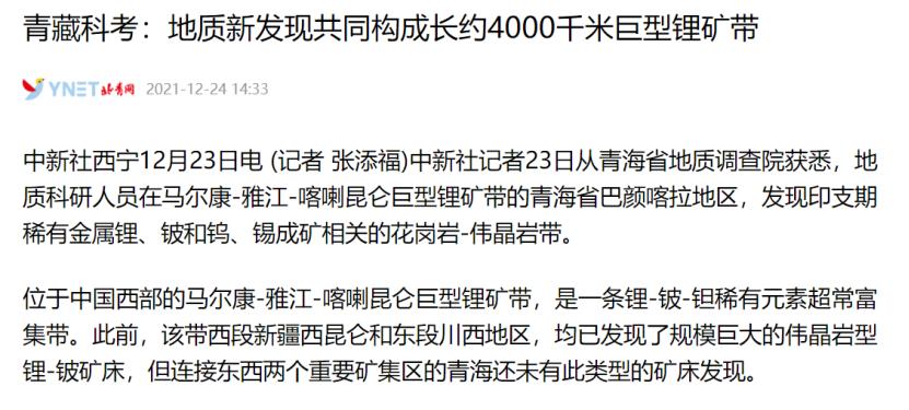 据青藏科考,地质新发现共同构成长约4000千米巨型锂矿带。