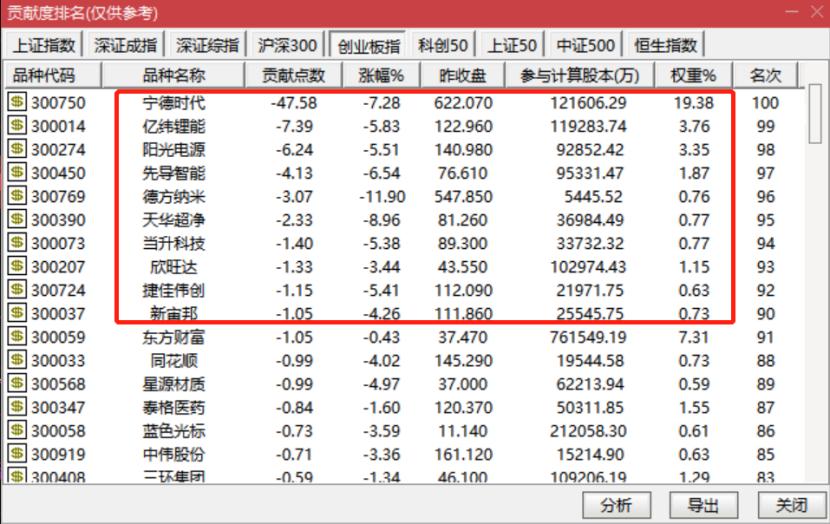 说新能源是带崩指数的“罪魁祸首”,其实一点不夸张。主板这边没咋跌,创业板杀跌的动能,主要还是来自锂电池。最明显的就是,今天创业板跌了77点,单锂电池板块里的宁德时代、亿纬锂能,还有权重大一点的几家几乎贡献了全部的下跌力量。
