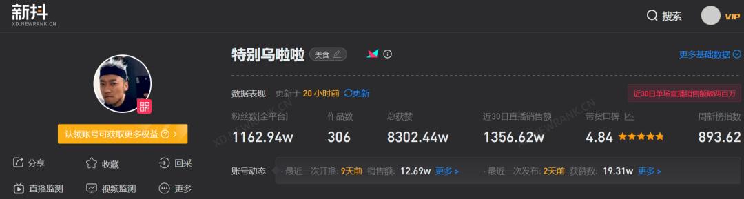 “特别乌啦啦”是头部探店达人,他“探”的是全国各地好吃不贵的特色美食,凭借有辨识度的声音、成熟稳重的外表、Vlog探店风格积累了1162万粉丝。据新抖数据,“特别乌啦啦”近30天直播销售额超过1356万,其中商品占比最高的是食品饮料。
