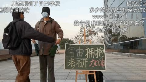 UP主@大学生华子 在考研自习室前立起了“自由拥抱,考研加油”的牌子,在寒风瑟瑟的冬日早晨,给为考研奋斗的同学一个无言的拥抱。