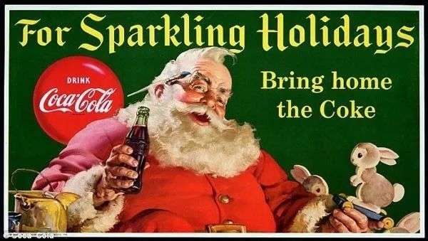 在首张圣诞老人海报中,这位身穿红袍、留着白色大胡子的老人面带慈祥微笑,一手摘下红帽子,一手举起一杯可口可乐,念出了那句自1929年推出的著名广告语:“The Pause That Refreshes(享受清凉一刻)”,这则处女秀广告第一次出现在《星期六晚报》中。此后,各类圣诞老人版的可口可乐广告还刊登在《女士家庭杂志》、《国家地理杂志》、《纽约客》及其他杂志报刊上,可口可乐会根据不同的时节相应地进行广告宣传,这些广告都大受欢迎,销量也在圣诞季连续翻了数番。