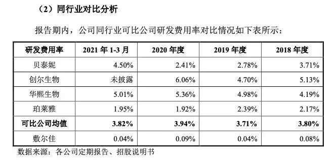 招股书显示,2018-2020年,敷尔佳的研发投入分别为30.78万、60.39万和147.97万,占营业收入的比例分别为0.08%、0.04%和0.09%;同期,同行业可比公司研发费用率平均值在3.82%。