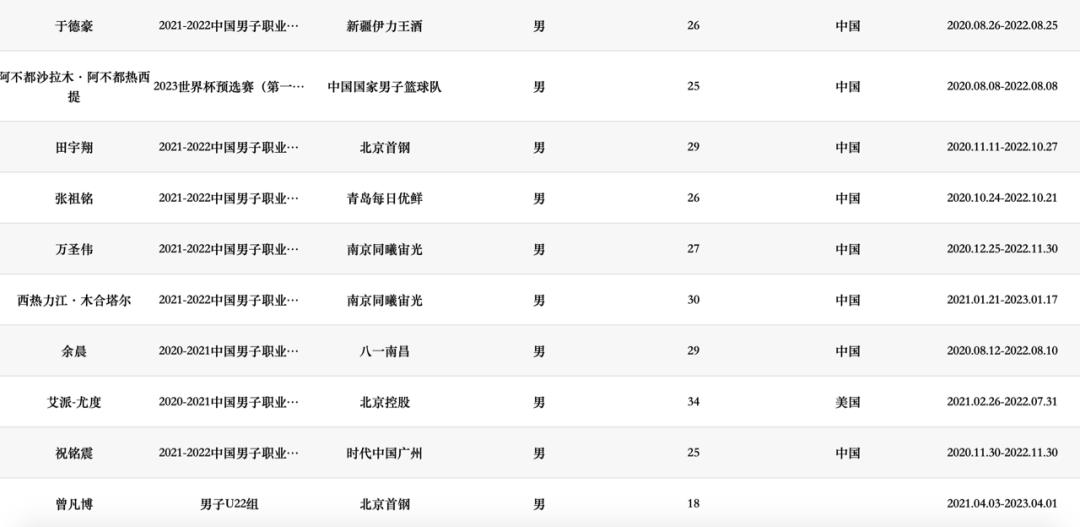 刘家成代理现役中国篮球运动员员名单