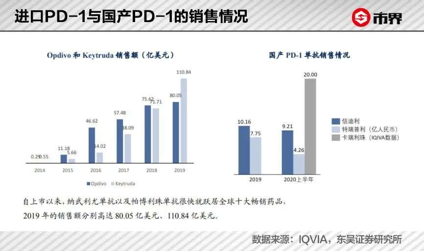 创新药就是印钞机,PD-1尤其如此。2018年6月和7月,百时美施贵宝的“O药”和默沙东的“K药”率先在中国上市。2019年两款药物的全球销售额分别高达80亿美元和110.84亿美元。