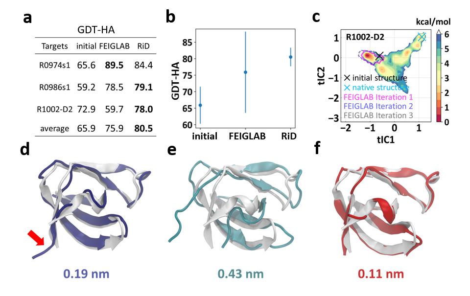 在CASP13比赛中三个典型例子(R0974s1, R0986s1 和 R1002-D2)上,RiD做到了大幅提升。相比于初始结构,RiD优化后的结构平均提升了14.6点GDT-HA分数,其中最高分数分别达到了92.4,82.6和79.7。同时,优化结果具有良好的鲁棒性(图a和b)。特别地,在R1002-D2的例子上,经典分子动力学模拟只采样的很小的区域(图c 紫红色区域),RiD可以从初始结构(图c 黑色X,图d)经过去折叠(图e),最终模拟到天然状态结构(图c 蓝色X,图f)。