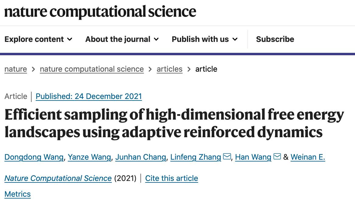 此项成果于近日登上Nature旗下专注于计算科学的顶级期刊《自然-计算科学》(Nature Computational Science),该期刊关注最新计算方法的发展及其如何在各学科中解决实际问题。论文题为《利用自适应强化动力学对高维自由能面进行高效采样》(Efficient sampling of high-dimensional free energy landscapes using adaptive reinforced dynamics),据了解,文章中使用了超过100个集合变量加速采样进程,此前的采样方法从未处理过如此高维的集合变量。该文章作者目前均在深势科技团队。这是继12月8日推出蛋白质结构预测工具Uni-Fold,并开源训练、推理代码后,深势科技团队的又一重磅成果。