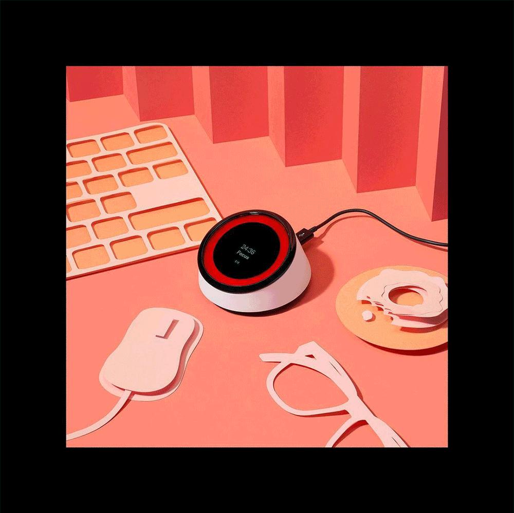 TimeChi 的顶部有彩色显示屏,通过 Wifi 可以连接到其他设备,用 App 或者 Chrome 扩展程序进行设置,一旦启动会立即将连接的手机和电脑切换成勿扰模式。亮起红灯和倒计时的它,还可以提醒其他人不要干扰,并且告知他们多久之后将会转入绿灯的空闲状态。