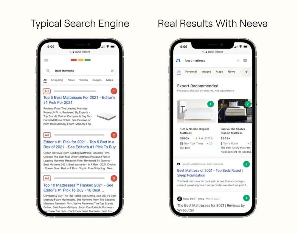 ▲ 传统搜索引擎(图左)和 Neeva 搜索引擎(图右)的对比. 图片来自:Neeva 官网