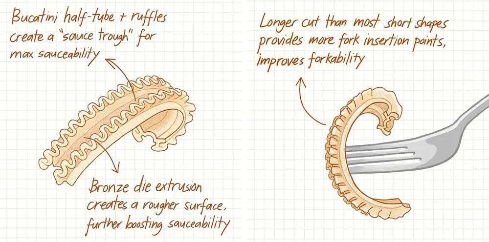 Cascatelli 意大利面长得有点像我们常说的「通心粉」,不过这样的形状可是经过多番研究和反复测试的,最终的成品在酱汁附着性、叉子易食性和牙齿咀嚼感上都几近完美。