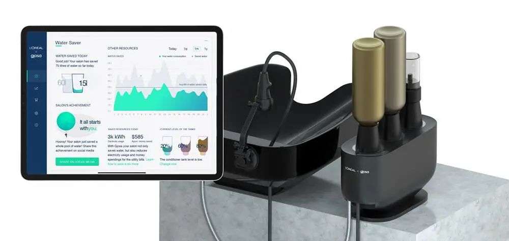 2021 年国际消费电子展上亮相的欧莱雅节水器,是欧莱雅和环境创新公司 Gjosa 联手发明的沙龙护发系统,同时也可以用于居家场景。