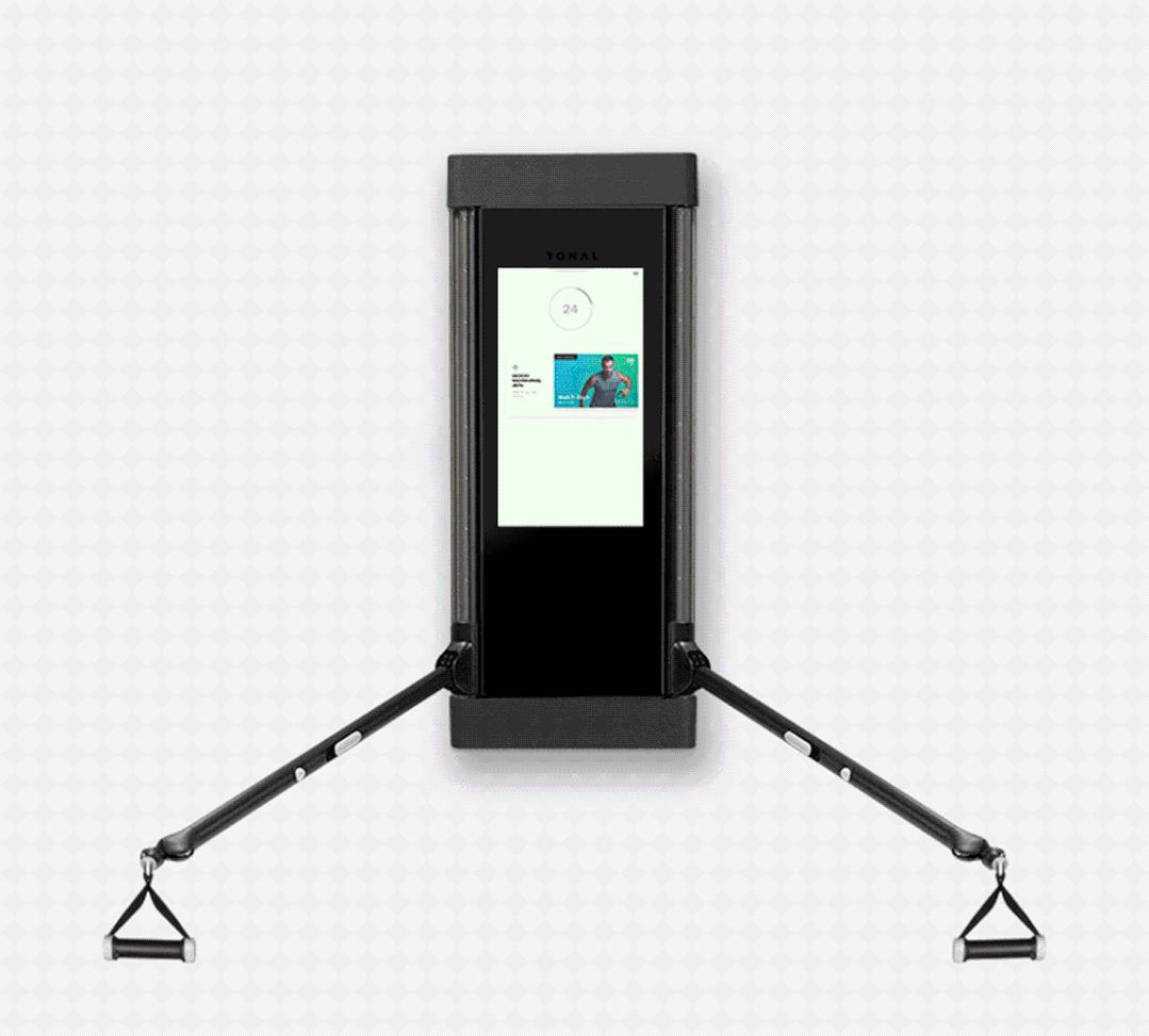 作为壁挂式机器的 Tonal,有一对可调节手臂,各内置一根电缆,提供共 200 磅的可调节阻力,可以支持数百种健身训练——既有传统的力量训练,还有瑜伽、普拉提和跆拳道课程。