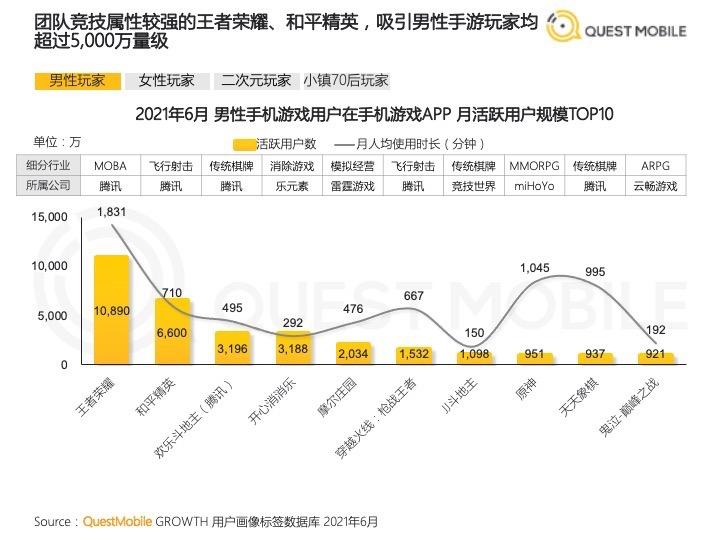 总体而言,自由+佛系的思路是成功的,《原神》不强制要求玩家花时间,并不意味着玩家耗时就少。QuestMobile数据显示,2021年6月,在男性手游群体中,《原神》月人均使用时长高达1045分钟,仅次于王者荣耀。但月活跃用户规模较低,951万,仅位列第8。