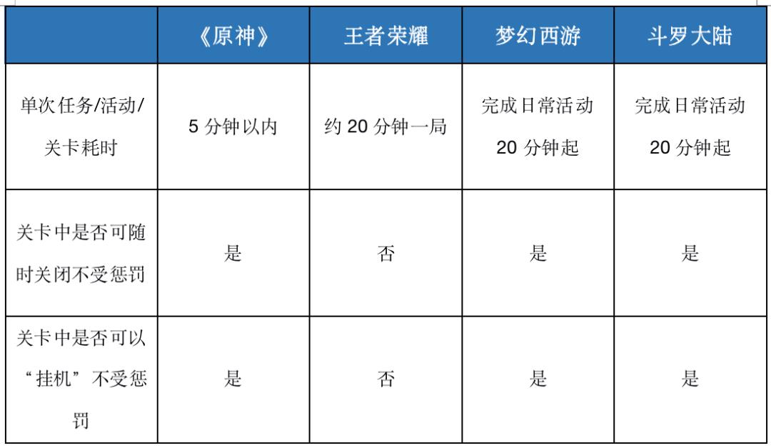自由+佛系的《原神》,满足了用户群体在碎片时间的休闲娱乐需求,且将碎片化做到极致——游戏时间单位低至5分钟,且随时开始、随时结束,没有惩罚或是心理负担。