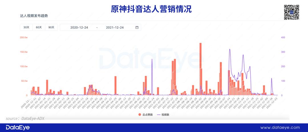 今年6月开始,《原神》的内容营销重心转向抖音达人营销。特别是10月,1周年期间,抖音短视频量、点赞数不断突破新高。