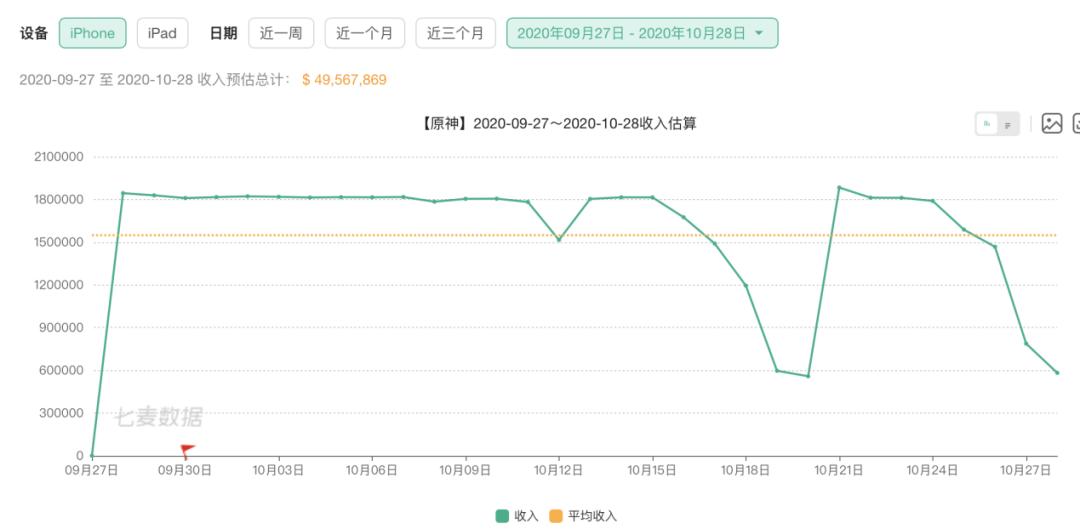 《原神》上线首月iPhone收入预估,截图自七麦数据