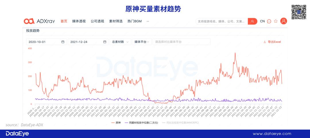 通过DataEye-ADX平台数据,我们可以看出《原神》去年上线至目前在买量上投入不大,高于二次元题材投放中位数,但单日投放峰值不超过400素材,属于中等水平。今年6月开始,《原神》也开始加大买量力度——国内大多游戏靠买量拉新,而《原神》相反,靠买量促活。