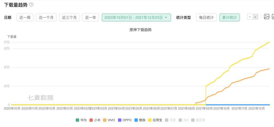 可以看出上图中,《原神》在应用宝渠道下载量快速飙升。
