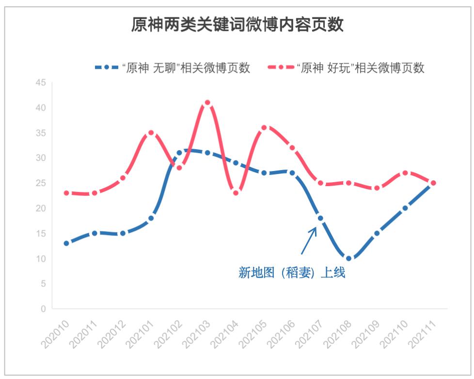 比如,在微博上,“原神无聊”关键词内容页数,单月超过30页,仅今年7月因新地图上线大幅下滑,随后又快速飙升。相反,“原神 好玩”关键词页数,则总体降低——《原神》似乎越来越不好玩,新地图拓展完以后,又开始无聊了?
