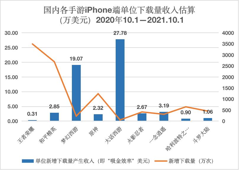 从“吸金”效率(单位新增下载产生的收入)来看,《梦幻西游》、《大话西游》虽然没有多少新增下载,却依靠庞大的存量持续带来高收入,而《原神》虽然新增下载量较高,但“吸金”效率一般,单位新增下载量仅带来2.3美元收入,低于一念逍遥,与其它手游相近。大IP《哈利波特》“吸金”效率略低,主要因为统计时间截至10月,《哈利波特》刚上线不久。