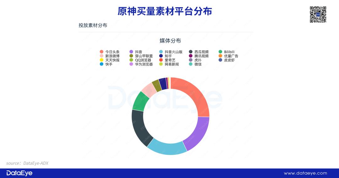 B站自然不用说,与《原神》二次元的属性完全重合,且是联运渠道。而大力侧重今日头条、抖音、西瓜视频,且效果明显,体现出这类大数据渠道精准营销的能力,获得了《原神》的认可。