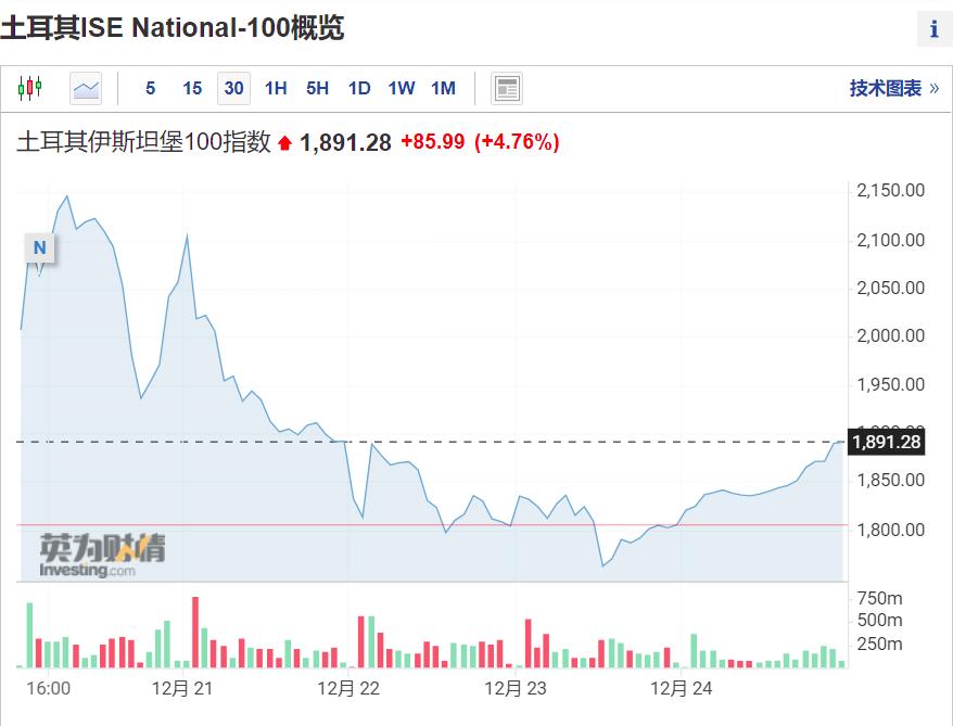 当地时间12月21日开盘后,土耳其伊斯坦堡100指数直接下跌,盘中一度跌超7%,日内二次触发熔断,近三个交易日共计上演6次熔断,同时创下20多年来的最大三日跌幅。