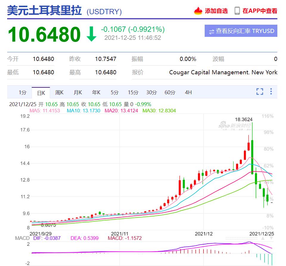 股市大幅震荡的同时,土耳其的汇率却在上涨。12月21日,土耳其里拉兑美元延续拉升走势,当日一度大涨超2.3%。而在前一天,里拉兑美元走势在短短数小时内,从低位直接上涨超30%,收复本月所有跌幅。据彭博数据显示,当天里拉兑美元的涨幅居全球首位,更是创出土耳其近四十年来的最大单日涨幅。截至12月25日22:30,美元兑里拉的汇率为10.648。