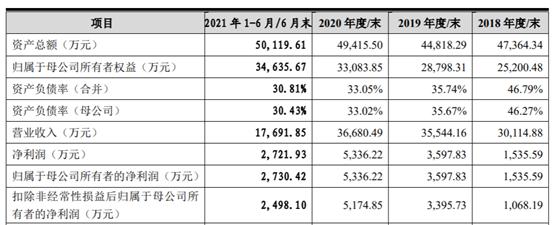 据招股书披露,2018年至2020年上半年,该公司实现营收分别为3.01亿元、3.55亿元、3.67亿元,年均复合增长率为10.36%;实现净利润分别为1535.59万元、3597.83万元、5336.22万元,年均复合增长率86.41%。截至2021年上半年,该公司营收继续增长至1.77亿元,净利润则增长至2498.1万元。