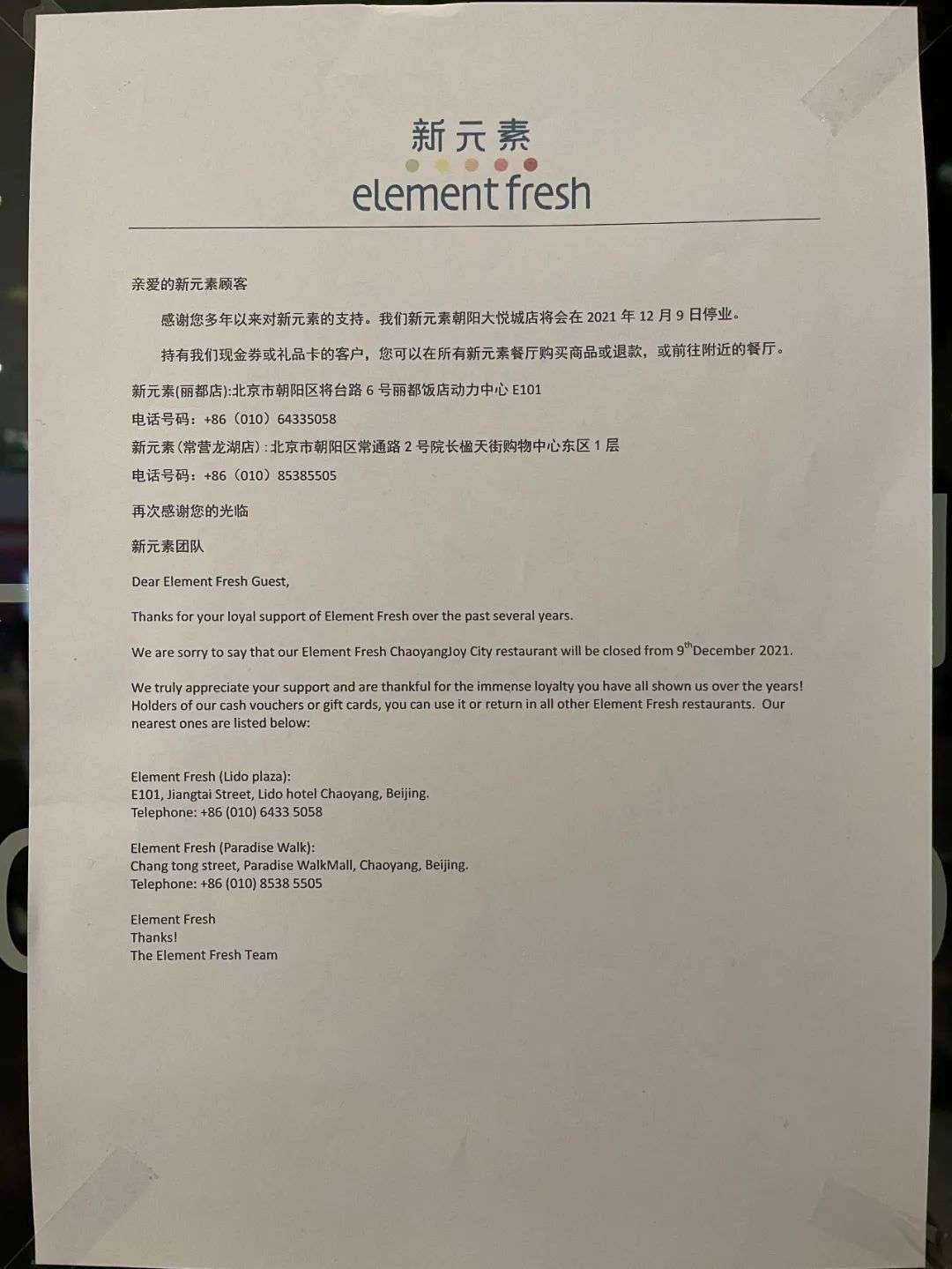 通知称,持有现金券或礼品卡的客户,可以在所有新元素餐厅购买商品或退款,或前往附近的餐厅。显然,通知上的新元素丽都店和新元素常营龙湖店还在正常营业。