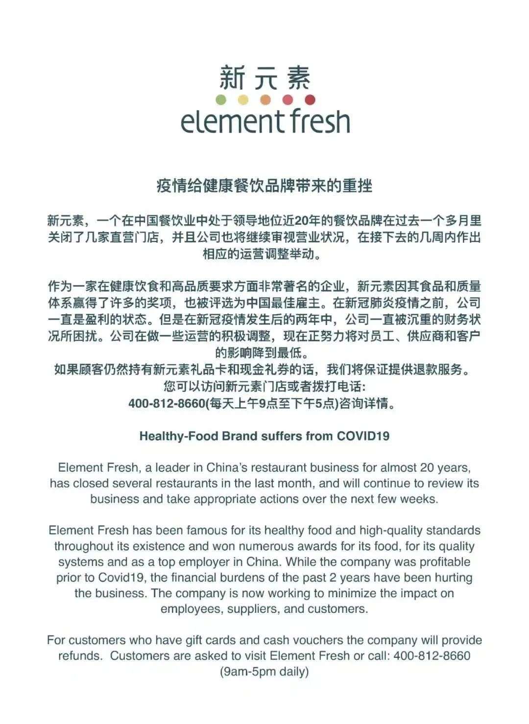 12月20日,新元素通过公众号发布写个新元素粉丝的信,信中指出,公司的财务状况主要源于疫情的冲击,现在正努力将对员工、供应商和客户的影响降到最低,并积极推进储值卡退款服务。